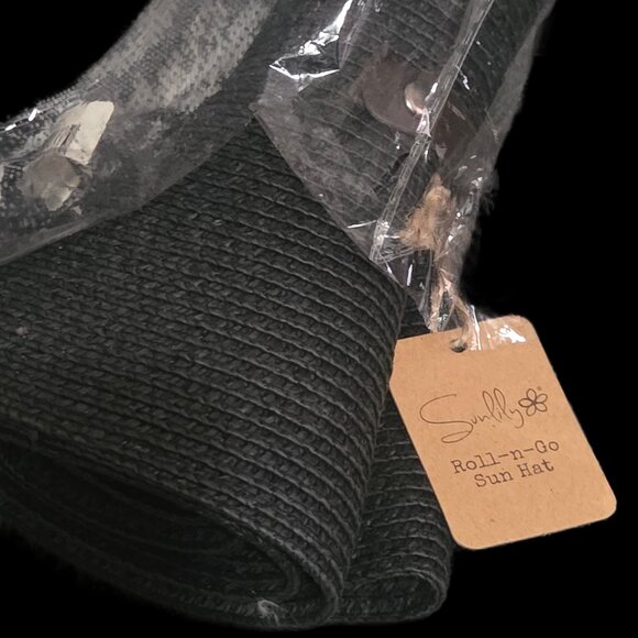 Brand new Sunlily "Roll-n-Go" Sun Hat in classic black. The ultimate travel accessory! This genius hat rolls up into a compact cone and secures with a snap button, making it perfect for suitcases or beach bags.