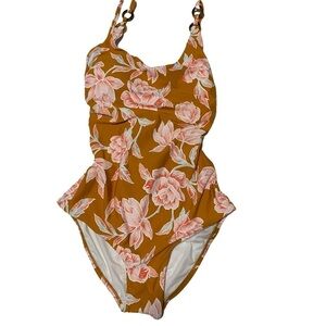Sunn Lab Swim One Piece Swimsuit Burnt Yellow Floral Print O Ring Size Large