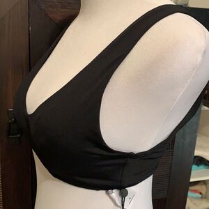 Super versatile black bikini top with wider straps decent coverage, and metal closure strap in the back. Can be matched with your favorite bottoms