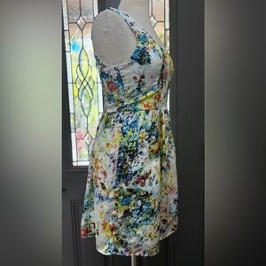Vibrant sleeveless dress with a floral multicolor pattern.