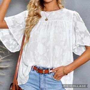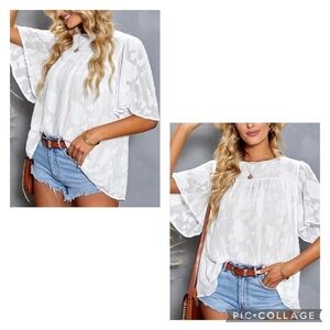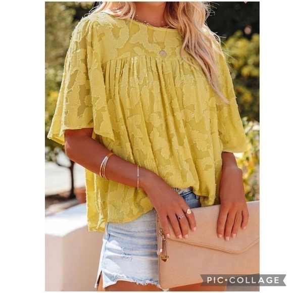 Sunny Gold Baby Doll Top. Beautiful print w/short wide sleeves. Full top. Stops @ end of waist. 100% Poly
