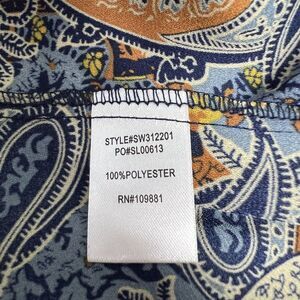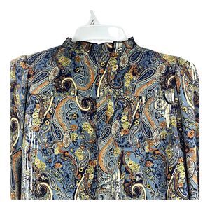 This flowy top ties at the neck and features a ruffled collar and puffy sleeves. The lightweight blue paisley print is made of polyester.