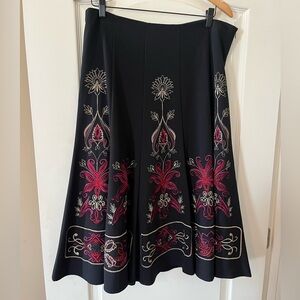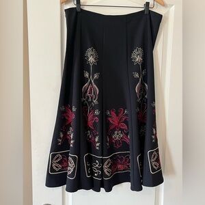 EUC excellent condition & quality! Elegant black mid length skirt with vibrant mixed color floral embroidery detail by Sunny Leigh. Polyester, rayon & spandex blend. Gorgeous detail, a standout piece! Side zipper. Measurements in photos. Women’s size 14. Smoke free home