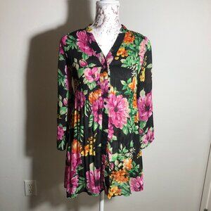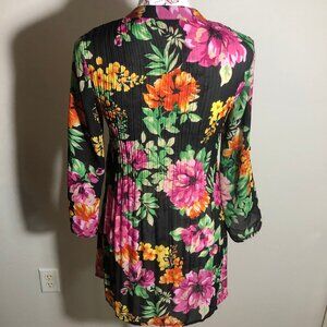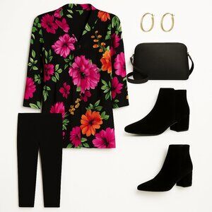 Elevate your wardrobe with this vibrant Sunny Leigh floral tunic โ a boutique-worthy statement piece that transitions seamlessly from everyday chic to polished workwear to elevated resort-ready looks. With its bold floral print against a black backdrop, flattering pleats, and button-front design, this tunic embodies timeless sophistication.