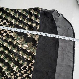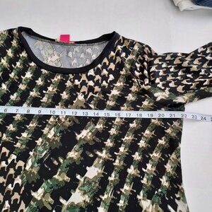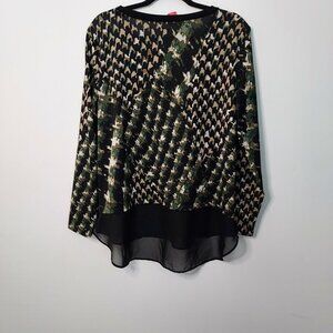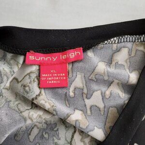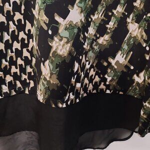 Size XLG Sunny Leigh long sleeve chiffon hem top. 95% polyester 2% spandex. Trim 100% polyester. Black with green and cream design throughout. Pit to pit 22" Pit to sleeve hem 18" Front length 27" Back length 30". Excellent pre-owned condition.