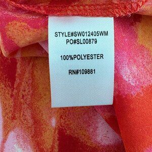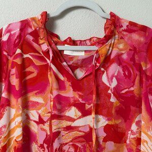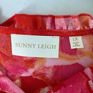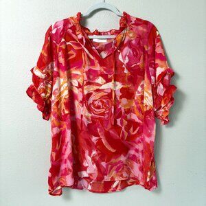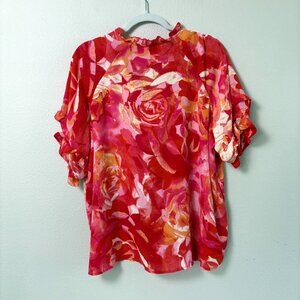 Sunny Leigh Top Plus Size 1X Red Orange Floral Ruffle Short Sleeve Split Neck