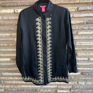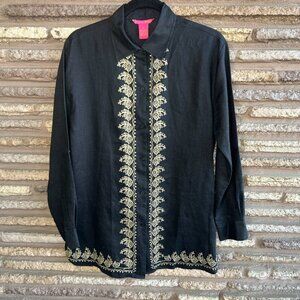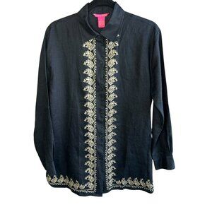 Sunny Leigh Vintage 100% Linen Black Embroidered Tunic Shirt Blouse Size Small