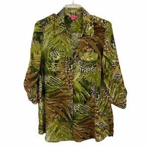 Sunny Leigh Safari Animal Print Graphic Button Down Sheer Blouse Size Medium