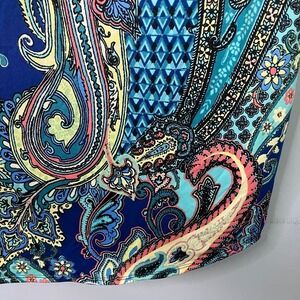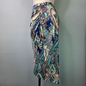 Sunny Leight Petites Blue Paisley Tulip Hem Faux Wrap Midi Pull On Skirt Women's Size PL. Feel confident and stylish in this beautiful Sunny Leigh Petites skirt. This skirt features a vibrant yellow peach and green colorful paisley print on a blue background. The flattering asymmetric hemline and a comfortable stretch jersey fabric keeps you confident and comfortable all day. Ruching and gathering on the left hip. Pull on style with elastic waist. It's perfect for any occasion, whether you're going to work, a party, or just out for a day on the town.