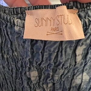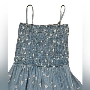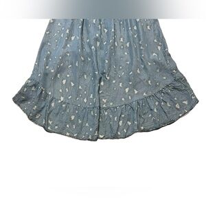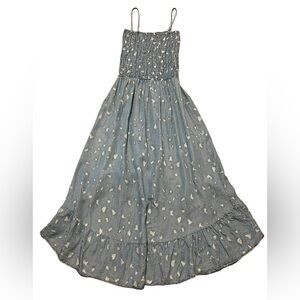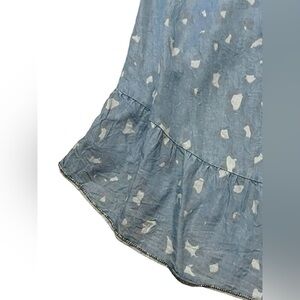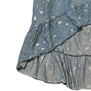 Sunny Studio Paris denim leopard print ruched spaghetti strap ruffle high low hem maxi dress boho