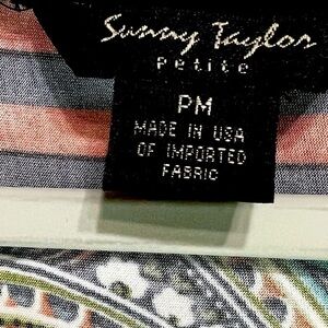 Sunny Taylor Petite Maxi Sleeveless Dress with Multi-Color Paisley Pattern, PM. Beautiful design boosts colors of orange, teal, brown, aqua, and olive green with black and black trim. Simple style, very flattering, made of 95% Polyester, 5% spandex. See images for measurements and fabric care. Made in USA