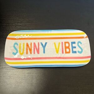 Colored stripes of pink, yellow, orange and blue. With SUNNY VIBES in the same colors.