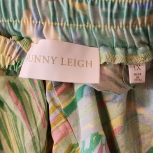Colorful leaf print pants by Sunny Leigh. Features a mix of green, pink, and yellow hues.pockets linen blend comfy
