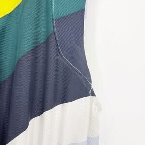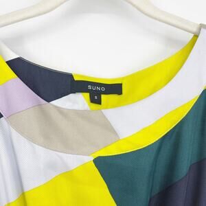 This is a Suno brand dress, known for its colorful prints and ethical production. It features a sleeveless design with a geometric pattern in shades of yellow, gray, green, and navy. The dress has a cinched waist and a tiered, pleated skirt. Suno was launched in 2008 by Max Osterweis and Erin Beatty, and they source materials and employ local talents from various countries. The brand has been worn by celebrities like Michelle Obama, Sofia Coppola, and Solange Knowles.