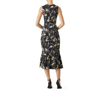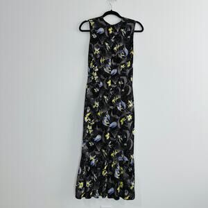 Suno Floral Ruffle Hem midi tea length Sheath dress. Size 4. In good pre-owned condition. Has a few areas of small running but nothing super noticeable as the pattern hides the small imperfections. Does not affect the quality or overall function of the garment. Printed black silk de chine (100% Silk). Sleeveless. V-neckline. Sheath bodice. Hidden back zipper with hook-and-eye closure.