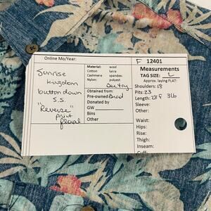 Picturing the Sunrise Kingdom men's size large "reverse print" (appears to be printed on the reverse side of the material - makes for a cool, faded look - see pictures) floral tropical casual button down shirt in mostly blue tones - would look great worn untucked Material: see picture of material tag in listing for more information. Size-L Approx measurements laying flat: shoulder to shoulder: 18" armpit to armpit: