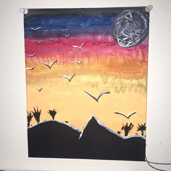 Painting with land surround the sunset around it.