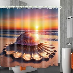 Transform your bathroom with this stunning sunset beach shell shower curtain. Featuring vibrant orange and gold hues, it adds a touch of coastal elegance to your space.