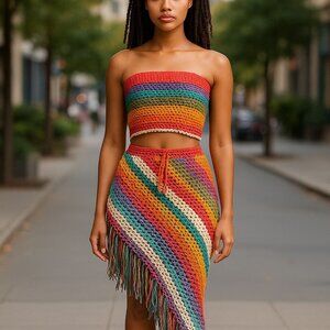 Turn heads with this bold and playful two-piece set! Featuring a rainbow-striped crochet tube top paired with an asymmetrical skirt finished with flowing fringe, the Rainbow Drift set brings boho vibes and summer fun to life. Perfect for festivals, beach days, or just soaking up the sun in style.