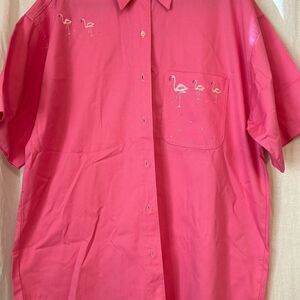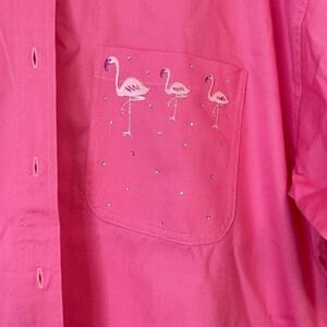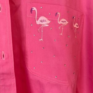 XL hot pink Flamingo front button shirt. Flamingos on both sides of front with sequin embellishments. Button down front made with a heavier weight material.