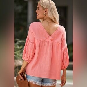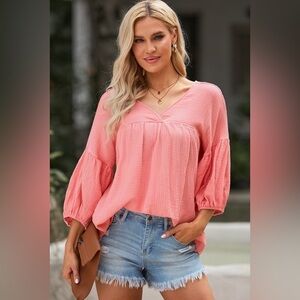 Sunset Coral Quarter Sleeve V Neck Cotton Blouse