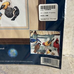 Here is a new old stock Vintage Sunset Cross Stitch Feeding Frenzy Marilee Carroll Many Birds feeding from a birdhouse. Unopened package from 2000, 18 count