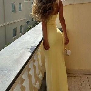 Sunset Date Yellow Elegant Women's Sweet Lace Trim Net Mesh Fitted Dress