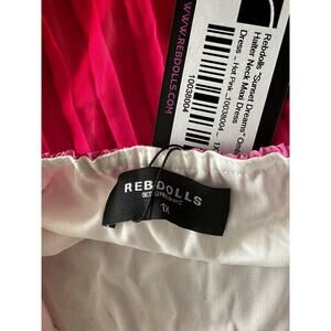 New Rebdolls halter pleated maxi dress in a stunning sunset ombre from yellow to purple. Features a gold tie-back neck and elastic back for comfort.