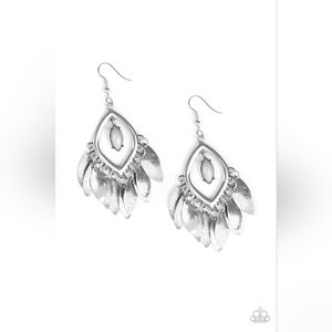 A polished gray bead swings from the top of a marquise-shaped silver frame. Delicately hammered in antiqued texture, flared silver charms cascade from the bottom of the frame, creating a noisy fringe. Earring attaches to a standard fishhook fitting. Sold as one pair of earrings.