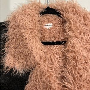 Sunset + Spring faux leather jacket with pink shag