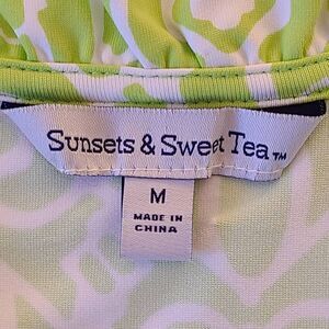 Sunsets and Sweet Tea UPF Green White Print Sleeveless Ruffle Collar Top Medium