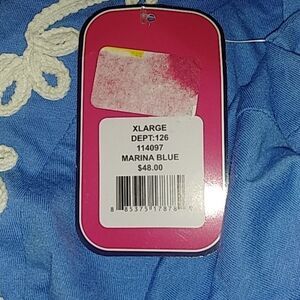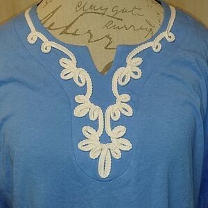 NWT Sunsets & Sweet Tea tunic top. Size is XL. Colors are blue and white. Measurements laying flat without stretching are: shoulder to shoulder 16" across, armpit to armpit 21.5" across, sleeve length 18" long and total length 27" long.