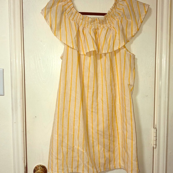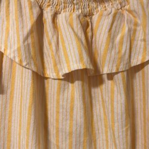 Yellow and white mini-dress with cold shoulders.