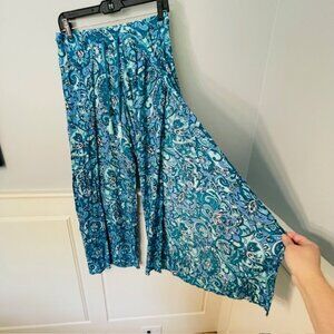 Shades of Aqua, Teal and Mint Green. Soft flowy and comfortable elastic waist wide leg pants. Carried at La Blanca, Pants are Split/open on sides for freedom of movement.