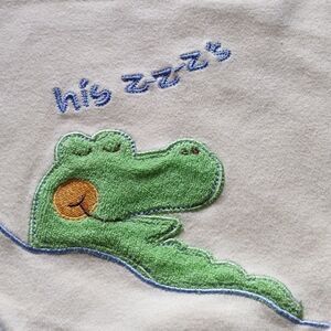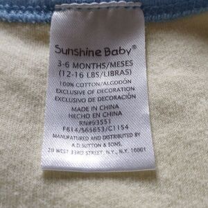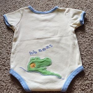 Sunshine Baby 3 to 6 months blue trim yellow background one piece, alligator applique front and back, says "What does the Gator Catch?" Back side says "ZZZZs" snap crotch and neck, excellent condition