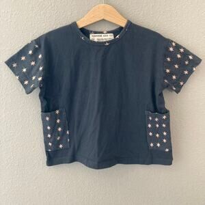 Oversized, boxy short sleeve t shirt dress with deep pockets in black with gold-brown stars on sleeves and pockets.