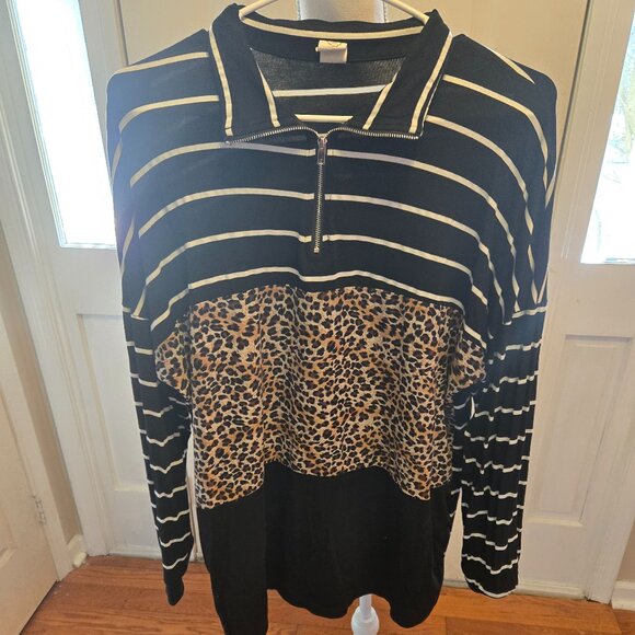Sunshine & Rodeo M top in black & white stripes with leopard accents. Zip top, very fun & cute to wear. Longer length, so cute with leggings & jeans, Looks cute with dress pants as well. Great all around dress up or down top. 50% polyester, 45& rayon, & 5% spandex.