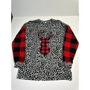 Festive Sunshine & Rodeos women’s holiday sweater in red and black, size large (L). Features a fun mix of leopard print and buffalo check patterns with a reindeer patch detail for a cozy, cheerful holiday look. Perfect for Christmas parties, festive events, or casual winter wear. Soft, warm, and stylish—adds personality and seasonal flair to any outfit.