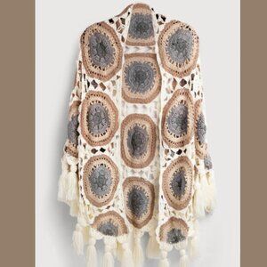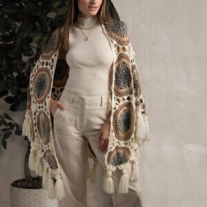 handcrafted shawl, crochet shawl, boho shawl, bohemian wrap, Saachi shawl, Indian handmade shawl, acrylic shawl, lightweight shawl, women's crochet wrap, boho fringe shawl, festival shawl, hippie wrap, tassel shawl, circle motif shawl, geometric crochet shawl, earth tone wrap, artisan-made wrap, 100% acrylic, made in India, ethical fashion, sustainable accessory, handcrafted in India, Indian artisan shawl, fall fashion, winter layering, travel wrap, gift for her, holiday gift idea, cozy fall accessory, everyday shawl, lightweight travel shawl