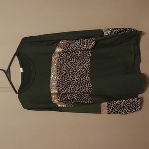 Dark green and leopard top with rose-gold sequins. Top is a 2X and fits 18/20. Light weight so it works through multiple seasons. Fits true to size. Great condition. No flaws. Pup friendly, smoke-free home. Will be freshly laundered before shipping.