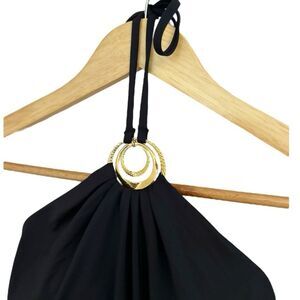 Adjustable straps that tie around the neck attach with a luxe gold ring. A high-cut front lengthens the legs, while moderate coverage in back keeps you confident.