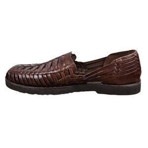 The Sunsteps Fisherman Huarache Sandals in men's size 10 are hand-woven in a solid brown color. These stylish slip-on sandals are perfect for casual travel, beach days, or vacation cruises. Made with leather uppers and a rubber outsole, they offer comfort and durability for all-day wear in summer, fall, or spring. The Mexican-inspired design with a coastal boho theme adds a touch of heritage and style to your resort wear collection.