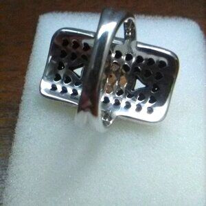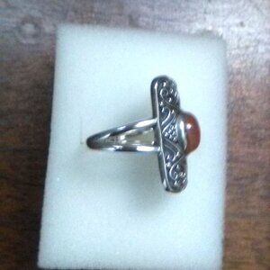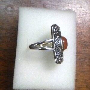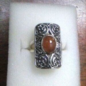 Oval Sunstone Cabochon set in an ornate shield Sterling Silver Ring. Stamped 925