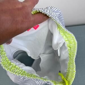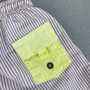 Sunuva Boys Gray & White Striped Swim Trunks. Boys size 5-6 years. Swim shorts in grey and white stripes with neon yellow tie and back pocket. Elasticized drawstring waist. Mesh lining. Perfect for the beach or pool!