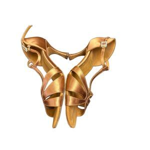 Supa Dance Dark Tan Sateen Leather designed Sandals. Please check photos for the wear . Very good in preowned condition. We ship the same day or next business day. Feel free to ask questions.