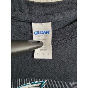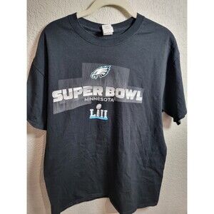 This Super Bowl LII T-Shirt featuring the Philadelphia Eagles in size Large is an officially licensed product by the National Football League (NFL). Made by Gildan, the black shirt is designed for men and is perfect for any football fan looking to show their support for the Eagles. It is a must-have item for any fan of the sport and the team, serving as a great souvenir to commemorate the historic Super Bowl win.
