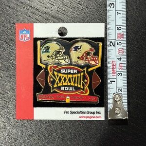 Super Bowl NFL Vintage Collectable Commemorative XXXVIII Pin. Commemorative Super Bowl XXXVIII pin featuring team helmets and logos. Perfect for collectors. New on original packaging. The helmets are slightly lifted around the edge from age. Please refer to photos for exact size, details, and condition.