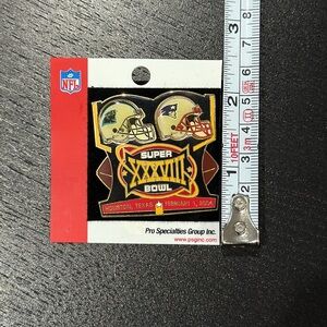 Super Bowl NFL Vintage Collectable XXXVIII Pin. Commemorative Super Bowl XXXVIII pin featuring team helmets and logos. Perfect for collectors. New on original packaging. The helmets are slightly lifted around the edge from age. Please refer to photos for exact size, details, and condition.