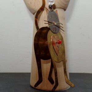 Super cool mixed metal 3D-iish hanging happy cat ornament ,some are listed as "Chicos" but i dont have no proof a that ,so i aint sayin nothin,this is about 4.5 inches tall from tip of tail to bottom of its cute little paws,mostly copper and brass with a silver metal face and a few pretty beads