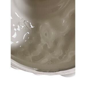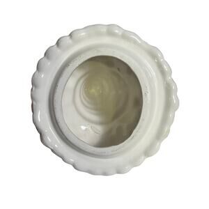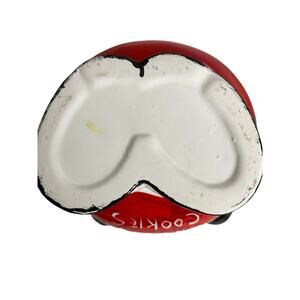 This super cute ceramic Santa cookie jar is in the original box and is in very good condition. It stands 12 inches tall by about 7 inches wide. There is some damage to the bottom lip of the lid, but it was done prior to glazing and the pieces are glazed inside The lid. No other chips or cracks. 4614.
